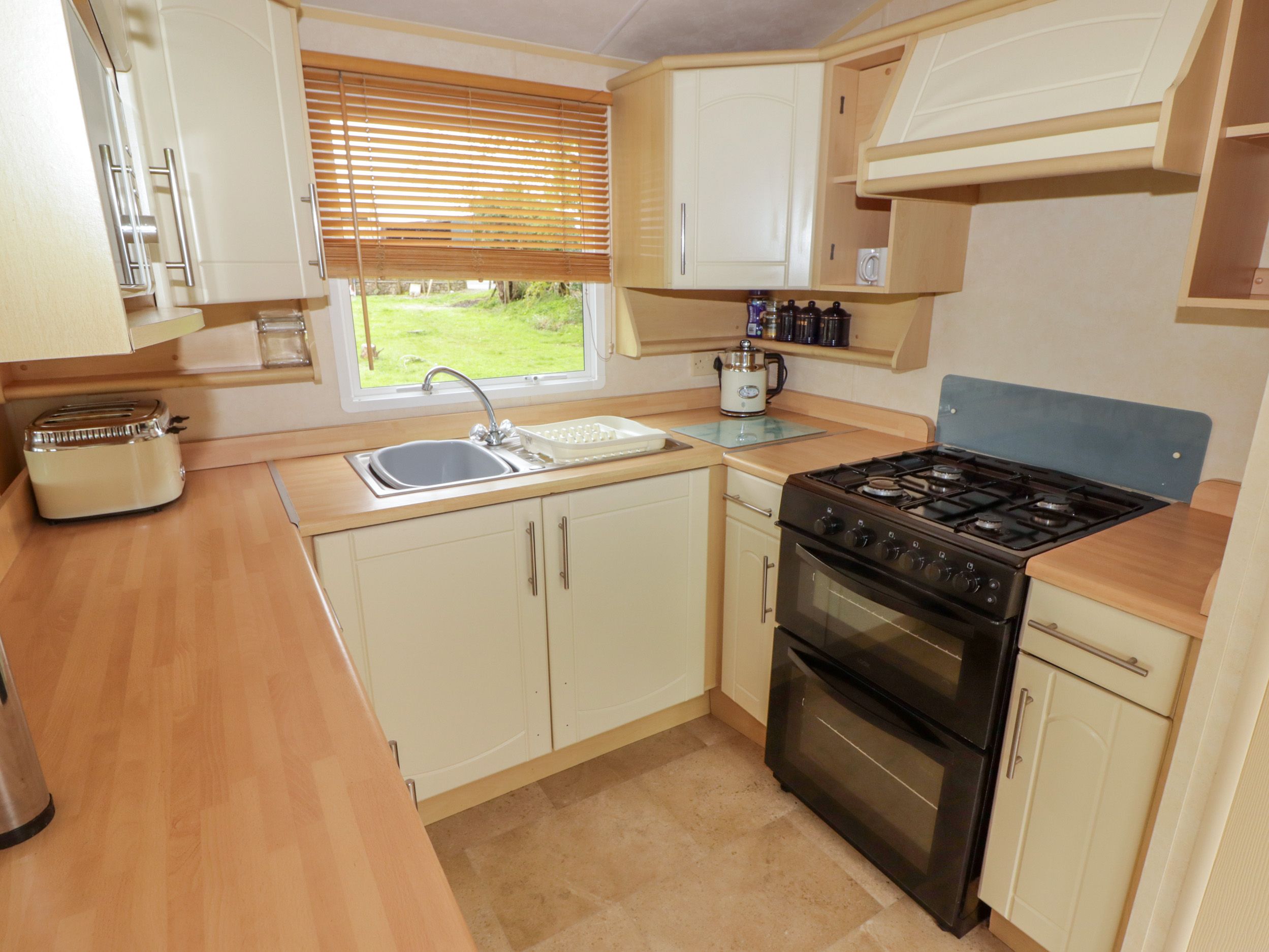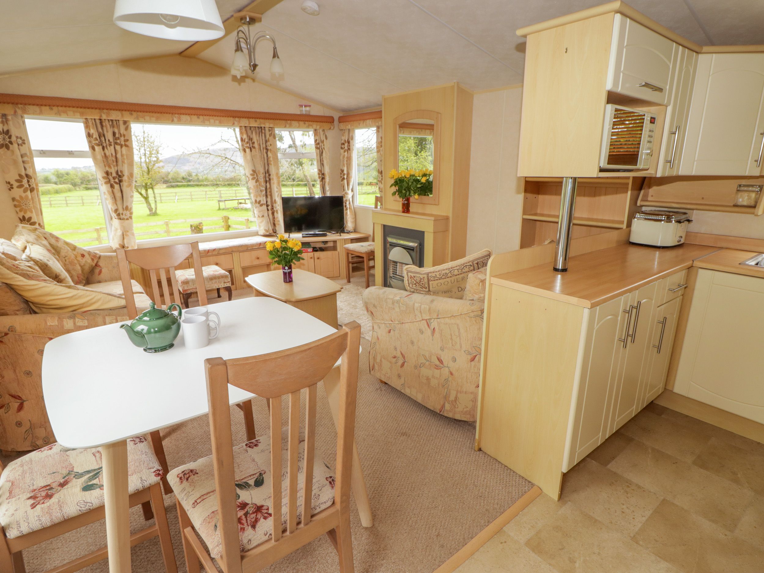 Holiday home Grandads Shack is a single-story caravan with two bedrooms: a double with Jack-and-Jill access to a shower room, and a twin. The shower room features a walk-in shower, basin, and WC. Its open-plan living space includes a well-equipped kitchen, dining area, and sitting area with a sofa bed and electric fire. Amenities include gas central heating, gas oven and hob, microwave, fridge, and air fryer. Entertainment options include a Smart TV, WiFi, and books. Fuel, power, bed linen, and towels are included. Outside, there's private driveway parking and an enclosed garden with decking, lawn, and picnic bench. One well-behaved pet is welcome. Sorry, no smoking. You can find a shop within 0.8 miles and a pub within 2.1 miles. Enjoy mountain views from a peaceful location at Grandads Shack. Note: Steps up to property. Sofa bed for flexibility; max. 4 guests.