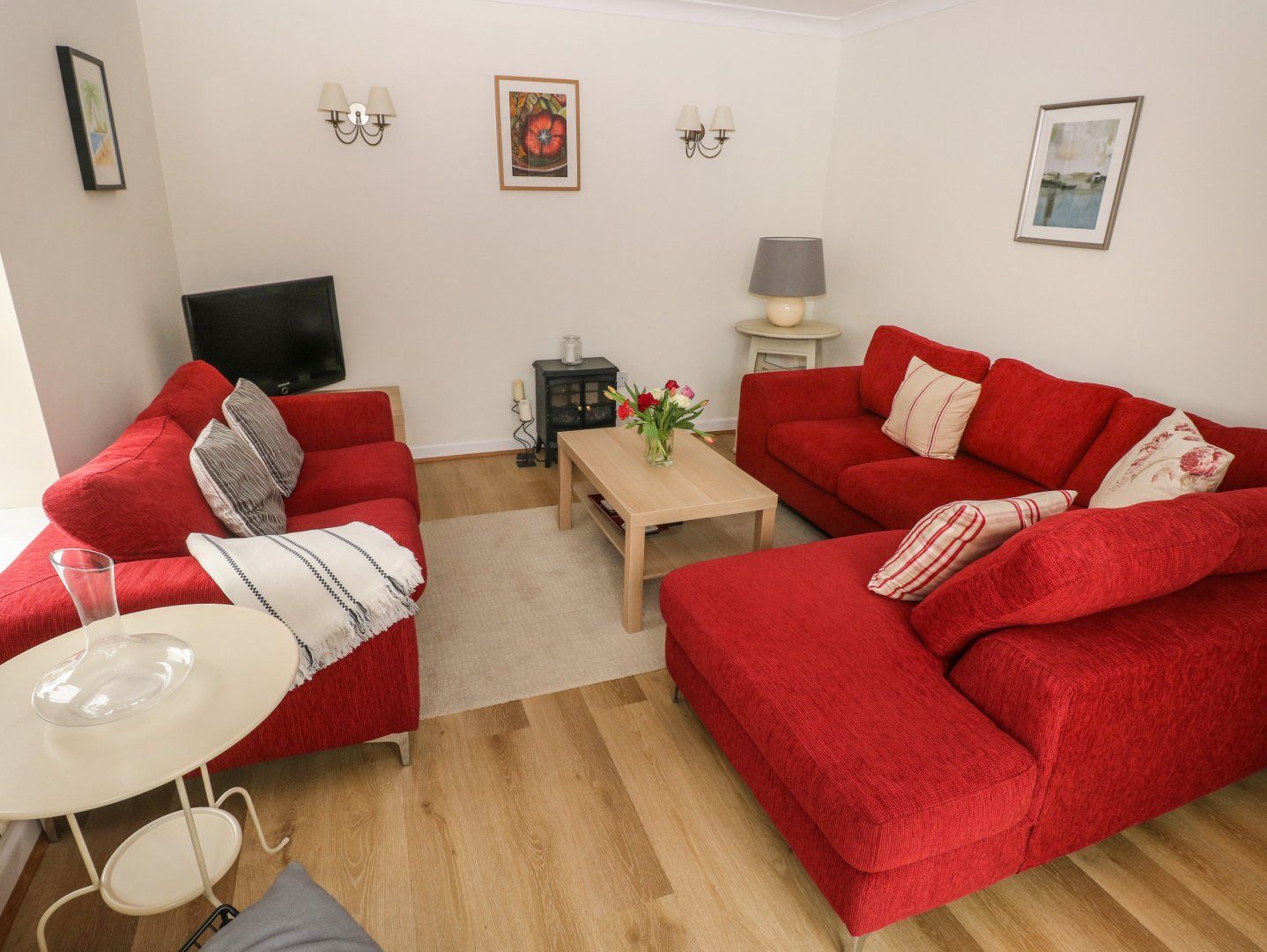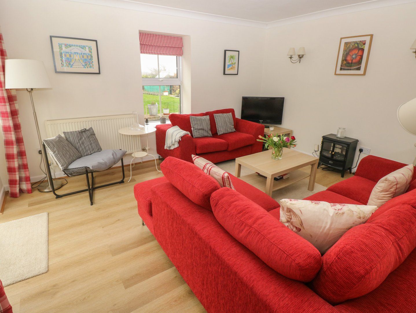 Two bedrooms: 1 x double with small balcony, 1 x twin. Bathroom with bath, shower over, basin, heated towel rail and WC. Ground-floor shower room with walk-in shower, basin and WC. Kitchen/diner. Sitting room with electric flame-effect stove