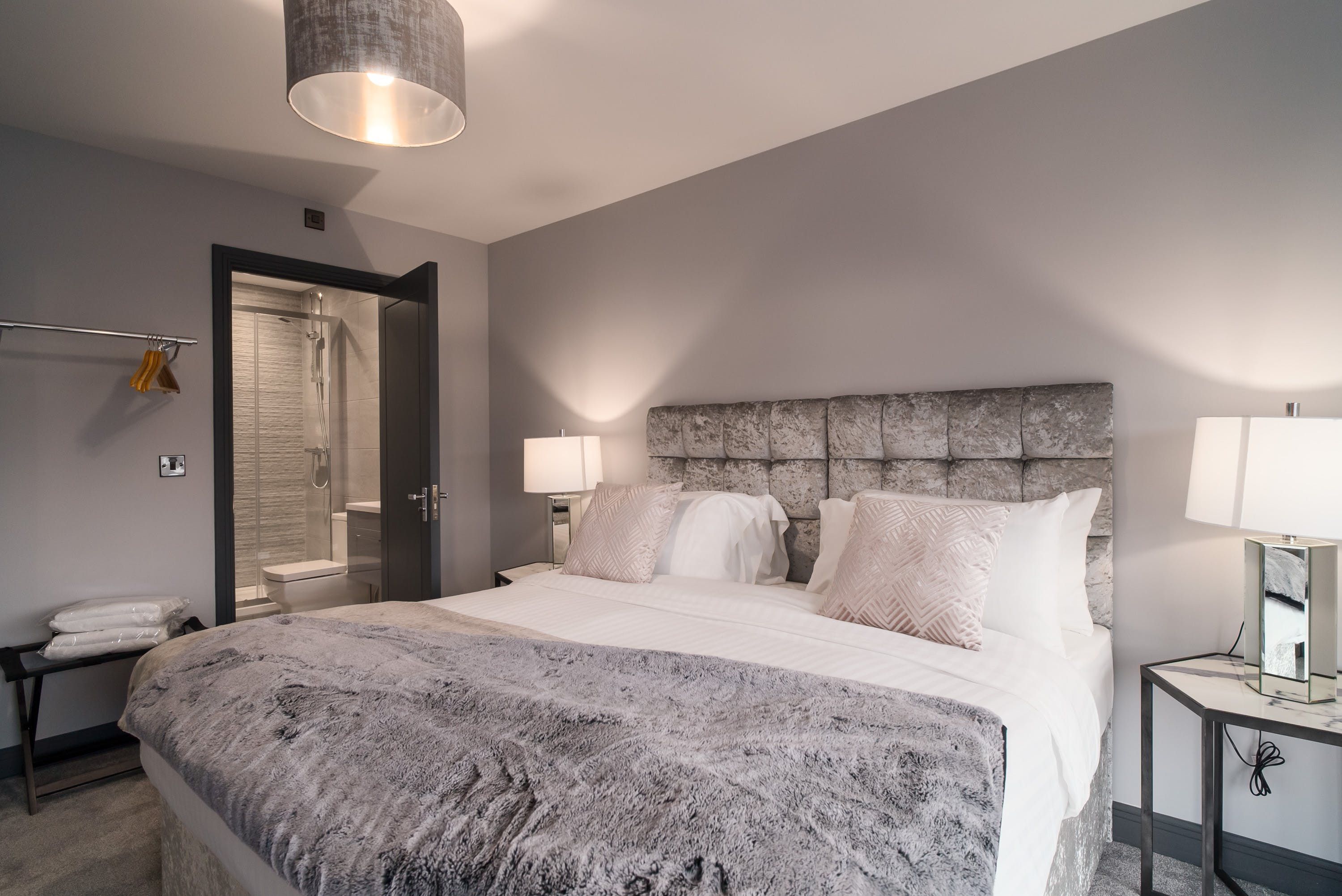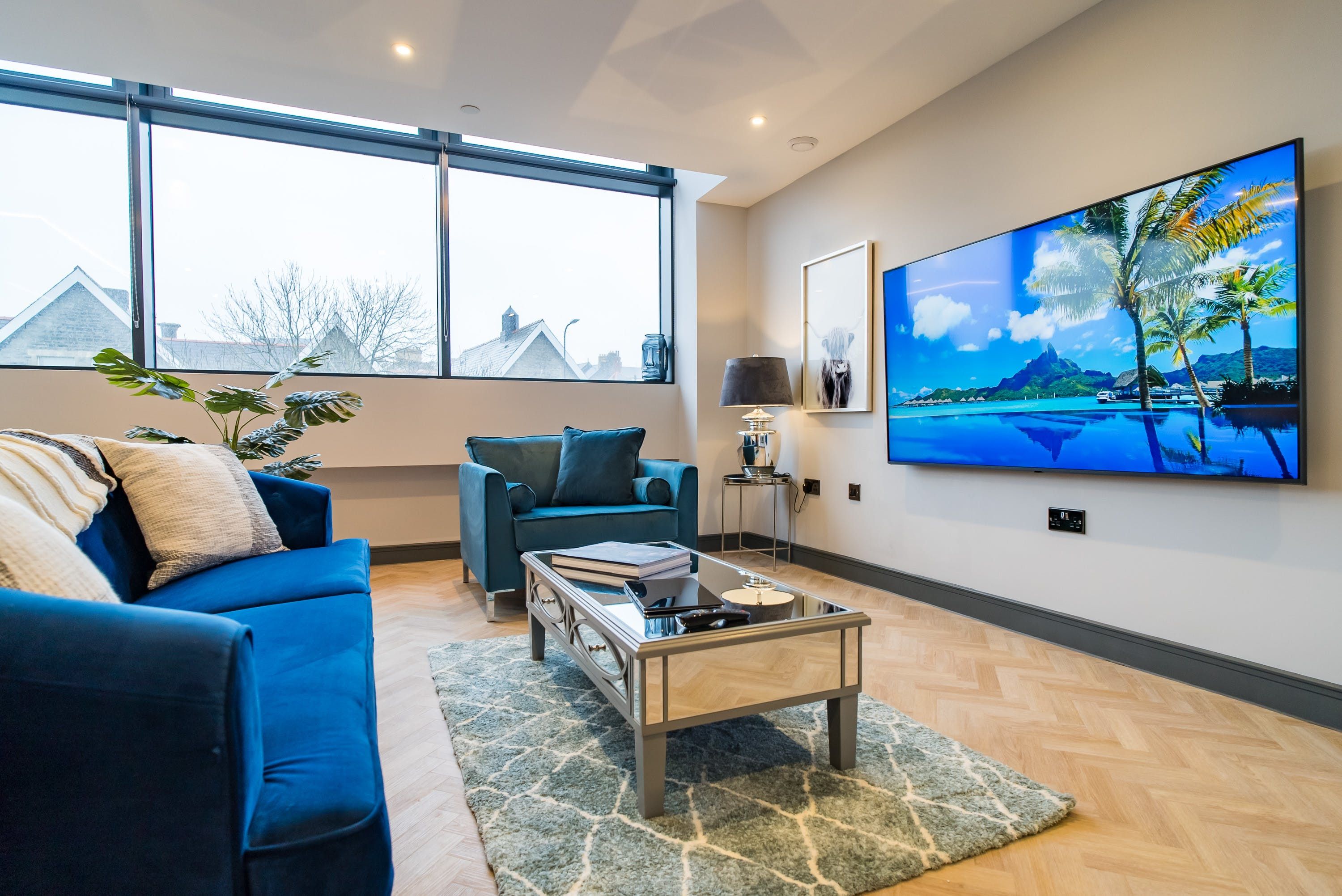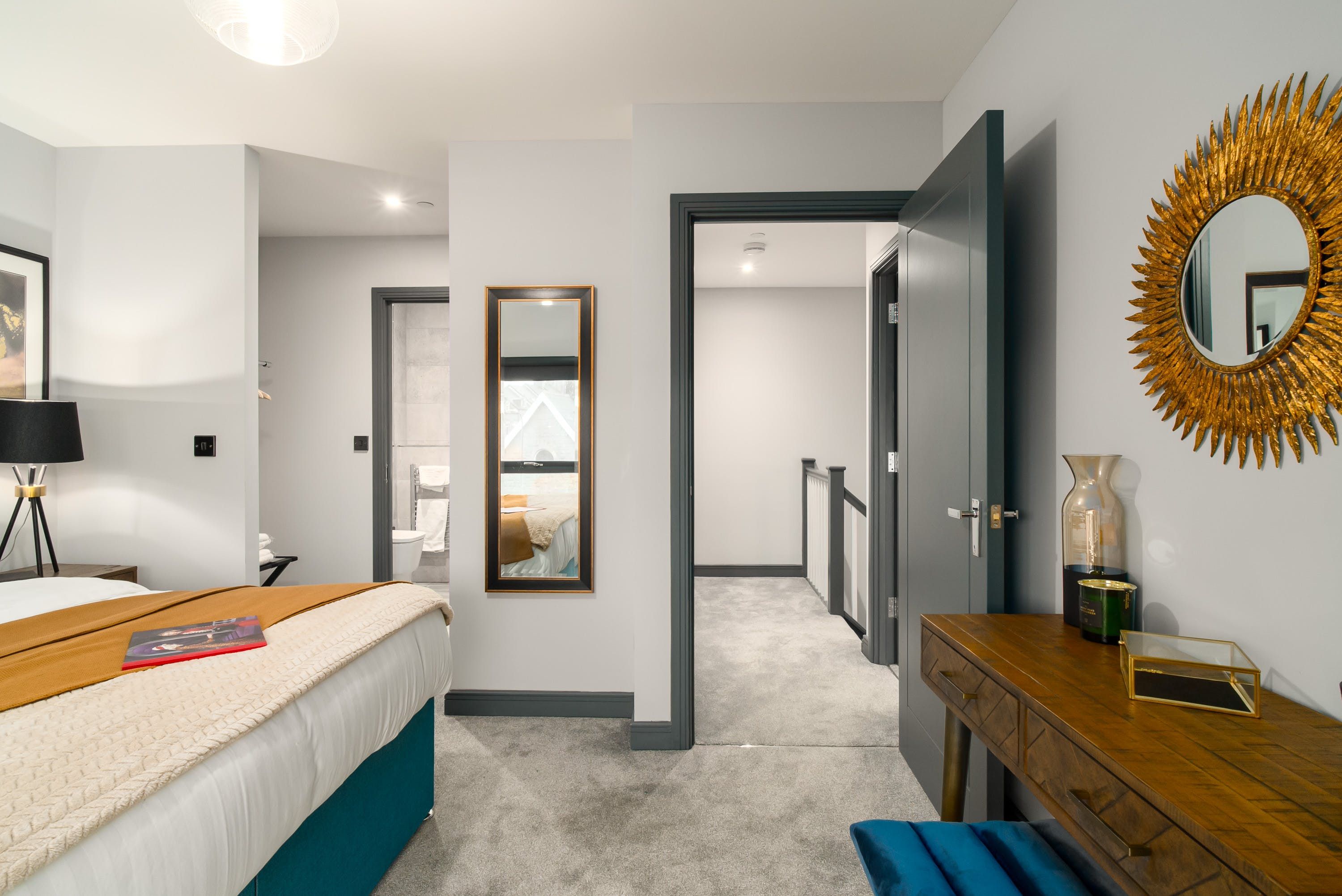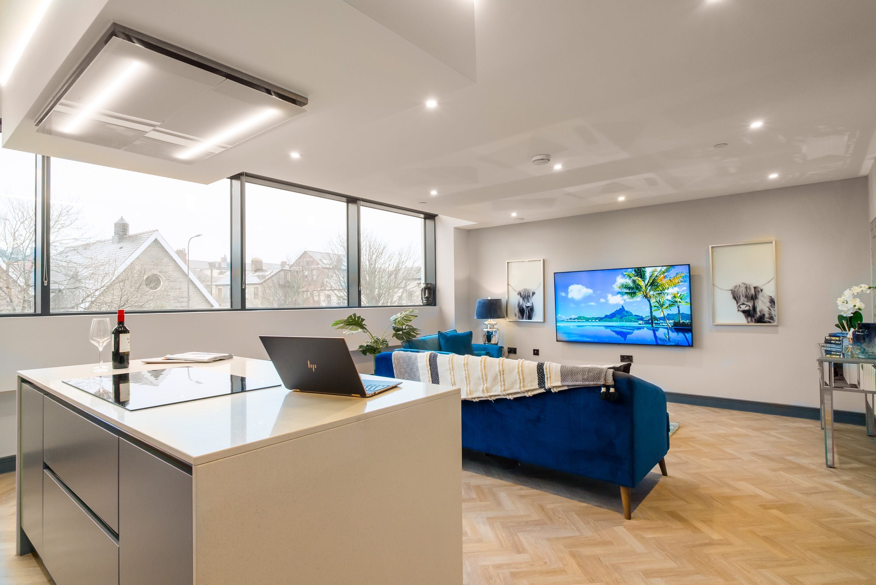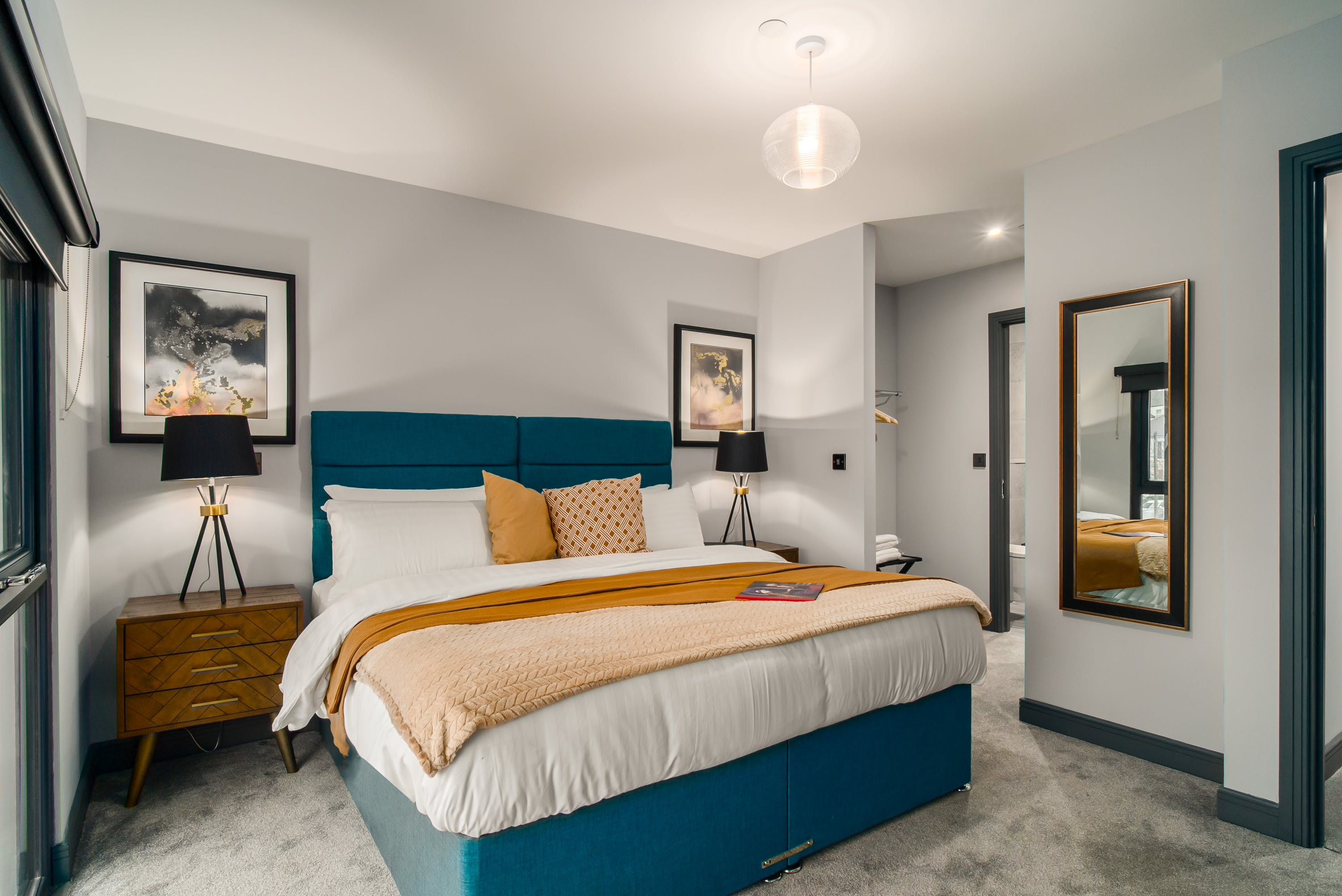 A wall of windows illuminates the generously proportioned open-plan living area and kitchen, which is where we envisage you spending most of your time cooking in the modern kitchen, socialising around the breakfast bar and relaxing on the chic blue sofas. Two large double bedrooms make for soothing sanctuaries of calm at the end of the day, with both enjoying access to their own private en-suite shower rooms.