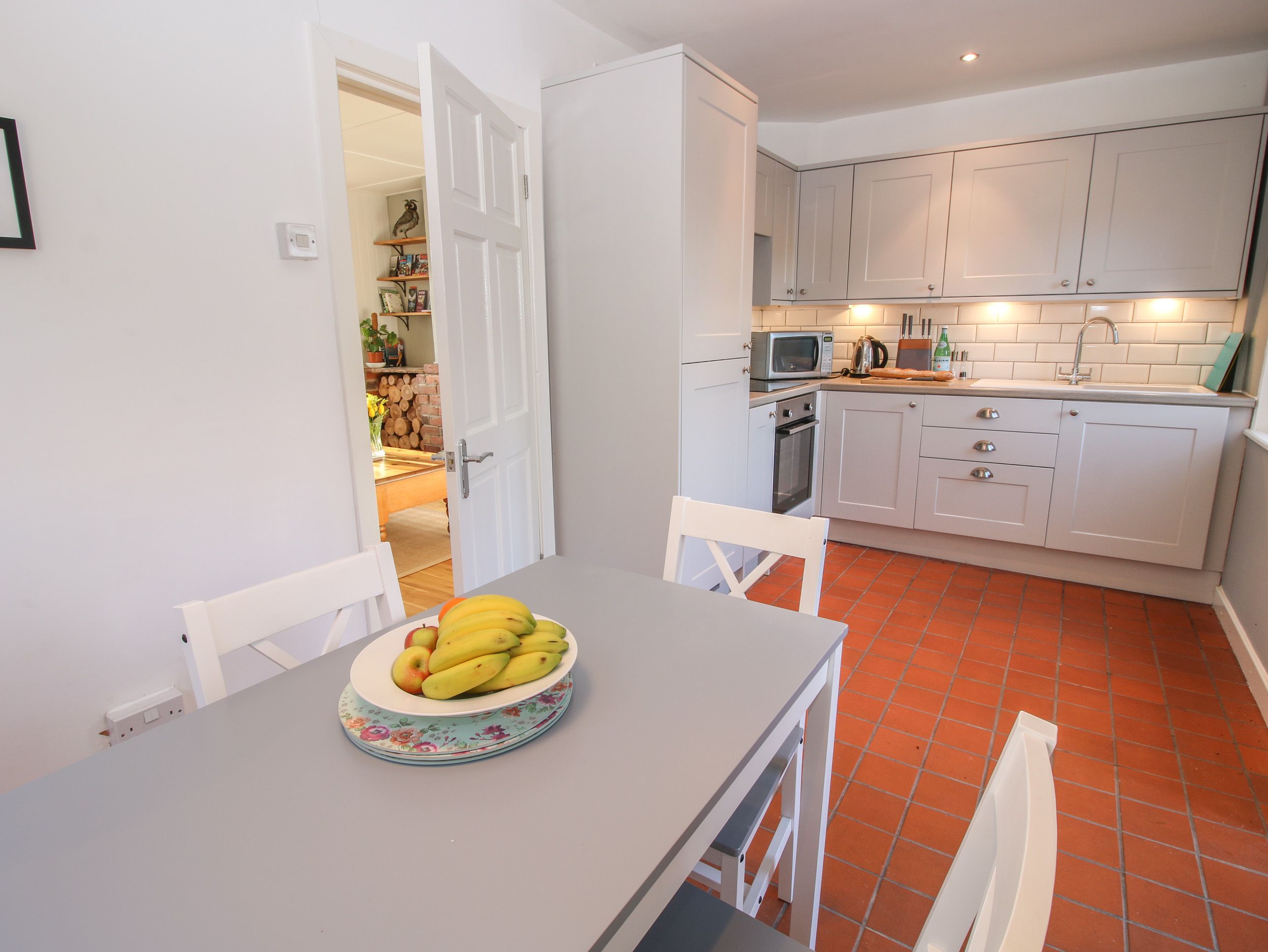 Two bedrooms: 1 x double, 1 x twin (zip/link, can be super-king-size on request). Bathroom with bath, shower over, basin and WC (please note the bathroom is on the 1st floor, no ground floor WC). Kitchen/diner. Sitting room with electric stove-effect fire