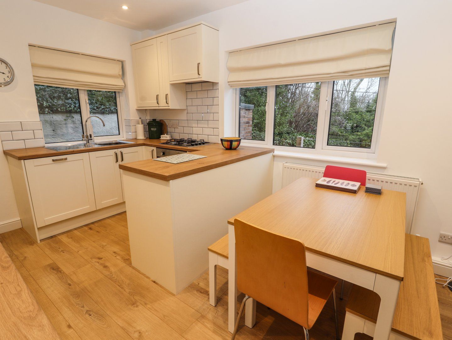Three bedrooms: 1 x ground-floor king-size, 1 x double with en-suite walk-in shower, basin, heated towel rail and WC, 1 x ground-floor twin. Ground-floor shower room with walk-in shower, basin, heated towel rail and WC. Open-plan living space with kitchen, dining area and sitting area. Utility. First-floor sitting room with sofa bed. Games room with board games.